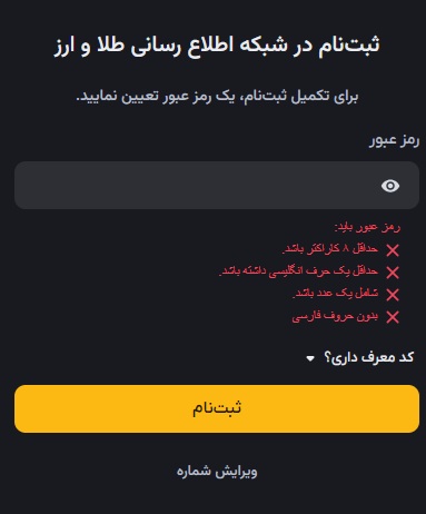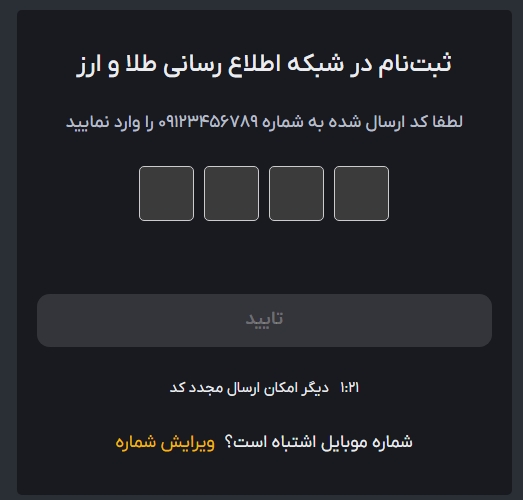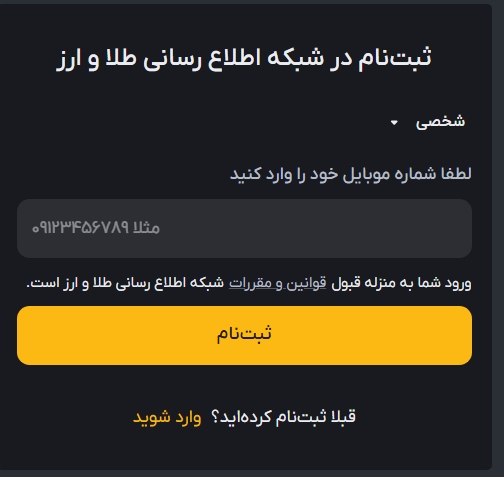 از طریق وب سایت یا اپلیکیشن صرافی رمز ارز شبکه اطلاع رسانی طلا و ارز با شماره تماس خود ثبت نام کنید.