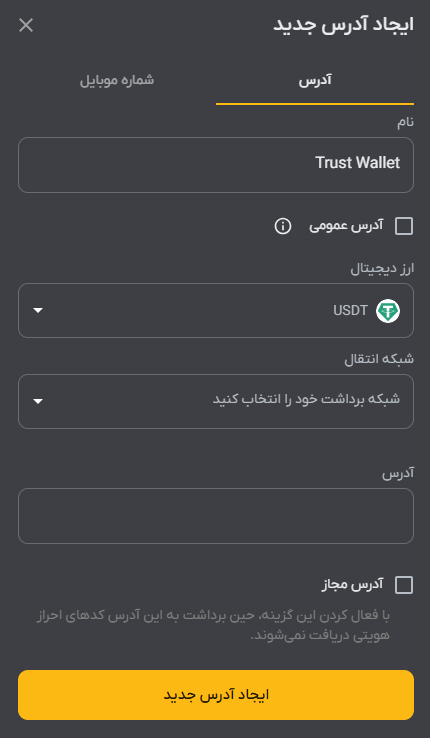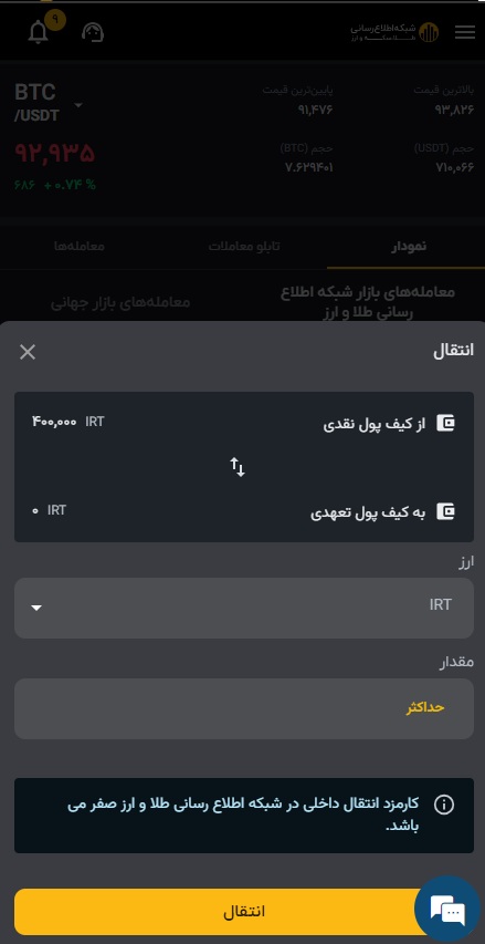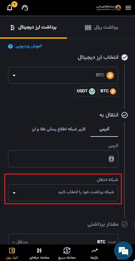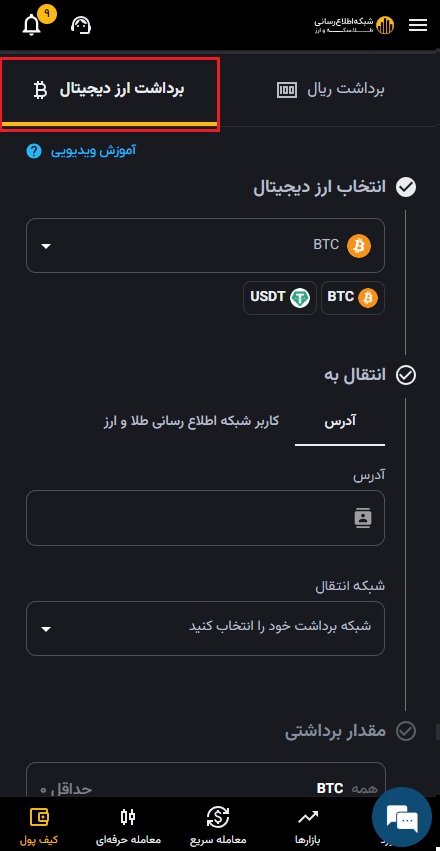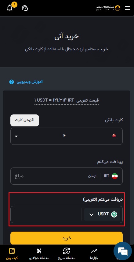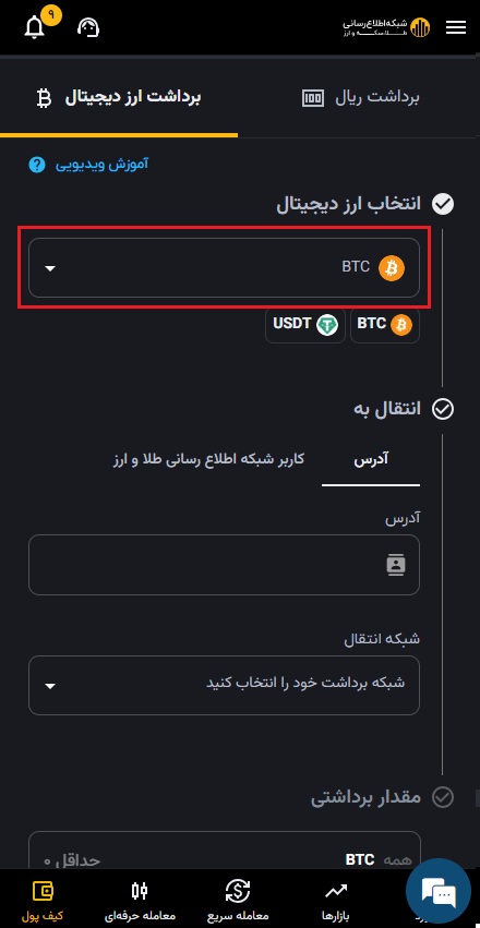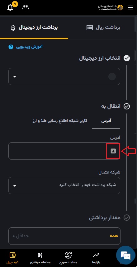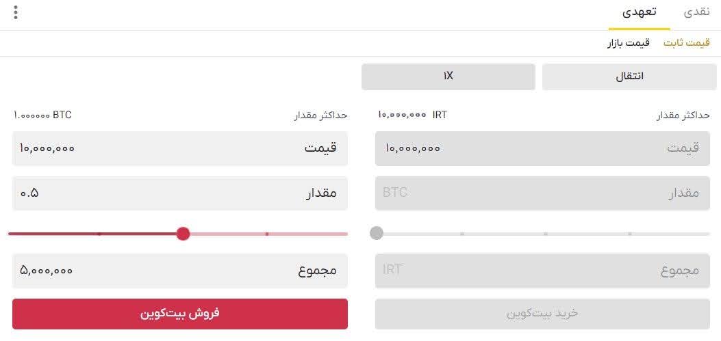 ۴) مقدار مورد نظر را به تومان یا میزان ارز دیجیتال مورد نیازتان وارد کنید.