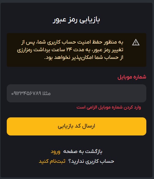 شماره ای که با آن ثبت نام کرده اید را وارد کنید. سپس ارسال کد بازیابی را بنویسید.