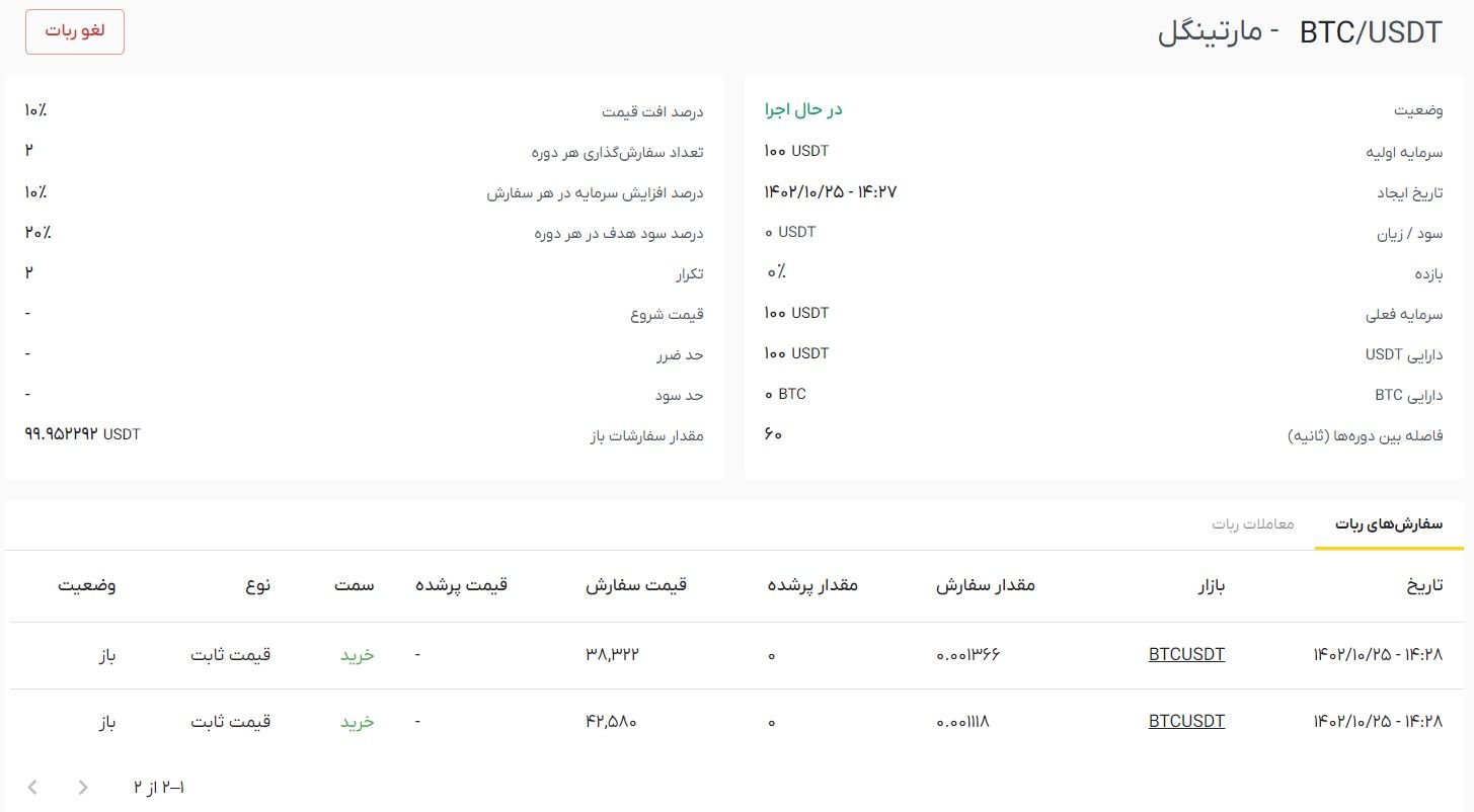 فرض کنید قیمت بیت کوین برابر با ۴۲,۵۸۰ تتر است. با وارد کردن مقادیر بالا، ربات معامله گر مارتینگل شما ساخته می شود.