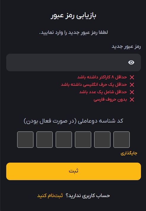 رمز عبور جدید مدنظر تان را وارد و روی دکمه ثبت کلیک کنید. (در صورتی که شناسه دو عاملی (2FA) را از قبل فعال کردهاید؛ آن را نیز در کادر مربوطه وارد کنید.).در نهایت رمز عبور شما بروز رسانی خواهد شد.