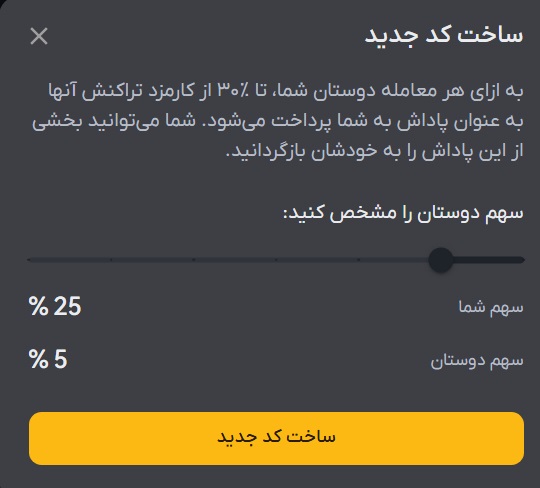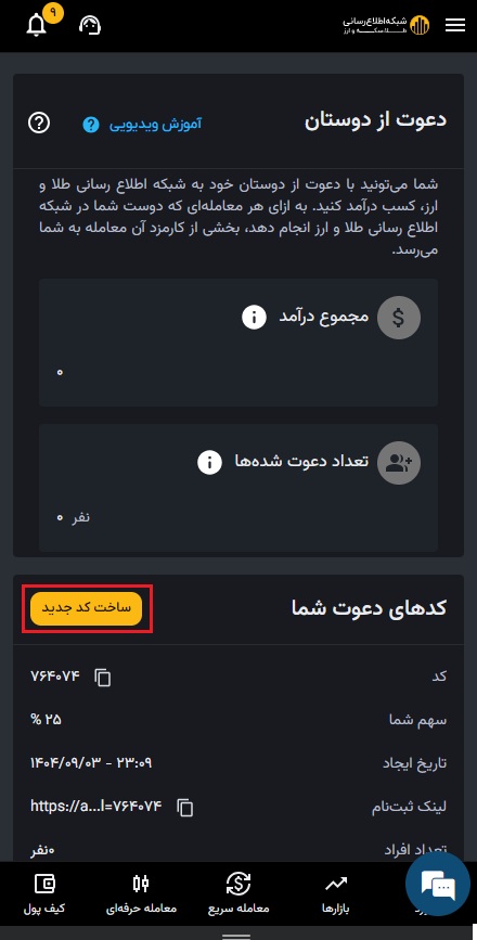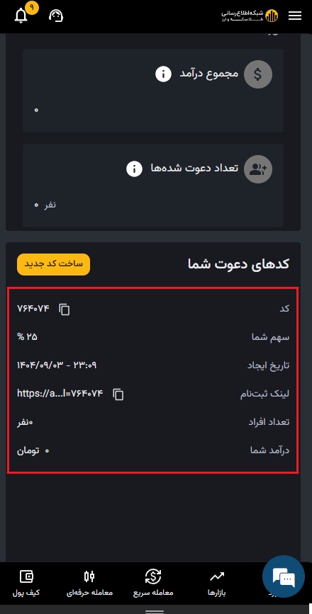 برای اینکه دعوت دوستان در سیستم ثبت شود و بتوانید سهم ۳۰% کارمزد را مدیریت کنید، لازم است برای آنها یک کد دعوت اختصاصی ایجاد کنید.