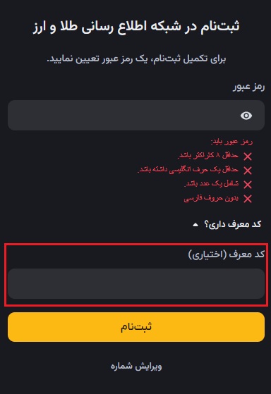در صورتی که کسی شما را با کد معرف به صرافی رمز ارز شبکه اطلاع رسانی طلا و ارز دعوت کرده است، می توانید با وارد نمودن آن کد در مرحله ثبت نام از مزایای دعوت شدن توسط دوستان بهره مند شوید.