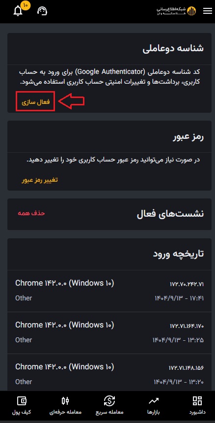فعال کردن شناسه دو عاملی امنیت حساب شما را تا حد زیادی افزایش می دهد. برای آشنایی با نحوه فعالسازی و استفاده از آن، قسمت شناسه دو عاملی را مطالعه نمایید.