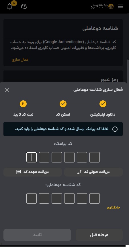 ۶) کد امنیتی پیامک شده و شناسه دو عاملی را وارد کرده و بر روی تایید کلیک کنید.
