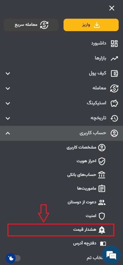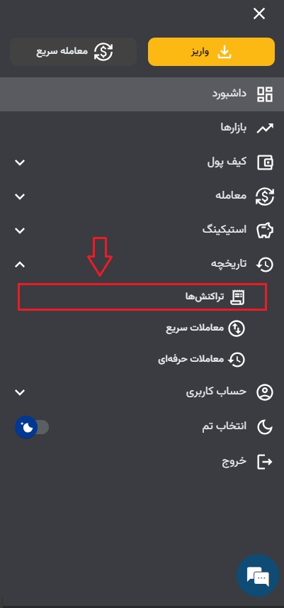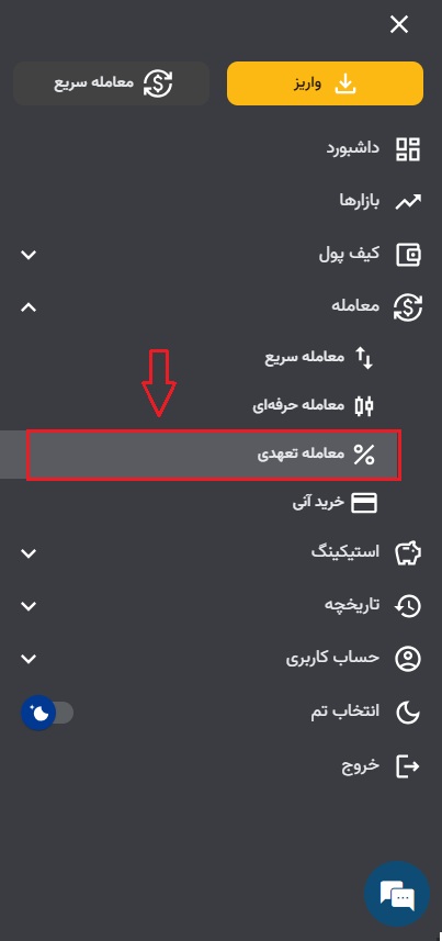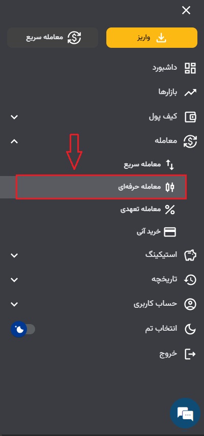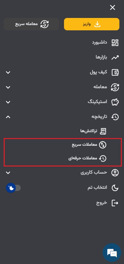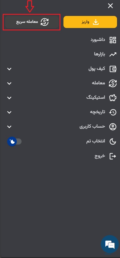۱) ابتدا وارد حساب کاربری خود شوید.در اپلیکیشن از قسمت بالا سمت راست بر ۳ خط سپس معامله و روی معامله سریع کلیک کنید