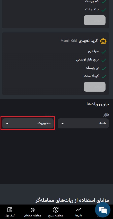 ۶) شما می توانید از قسمت برترین ربات ها، ربات دلخواهتان را کپی کنید. در صفحه ربات ها برترین ربات ها را براساس محبوبیت و بازده مرتبسازی کنید.