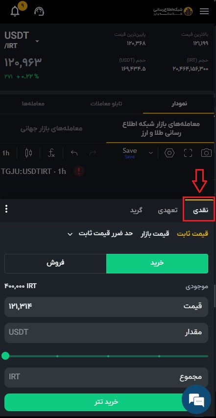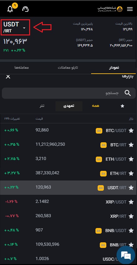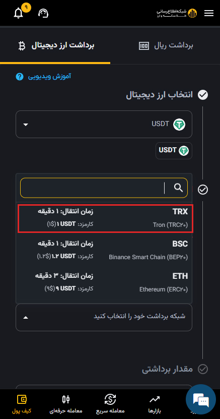 ۲) واحد پولی که میخواهید برای خرید ارز دیجیتال پرداخت کنید (تومان یا تتر) را به همراه ارز دیجیتال مورد نظر انتخاب کنید.