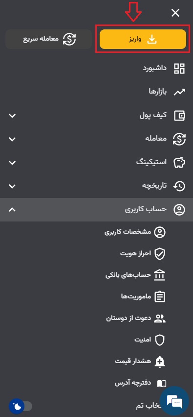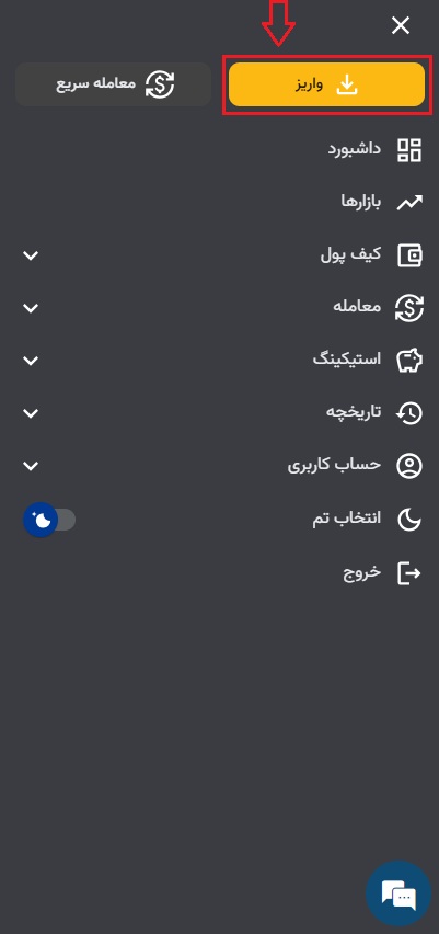 در اپلیکیشن از منوی بالا سمت راست بر روی سه خط سپس بر روی واریز کلیک نمایید.