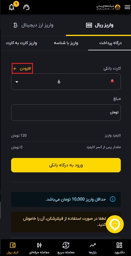 در صرافی رمز ارز شبکه اطلاع رسانی طلا و ارز هیچ مبلغی به عنوان کارمزد واریز ریال دریافت نمی شود و این هزینه مستقیما توسط درگاه های پرداخت و بانک مرکزی تعیین و کسر می گردد.