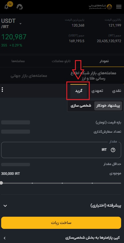 ۵) شما می توانید پارامترهای مورد نظر خود را در سمت چپ صفحه وارد کنید. این پارامترها شامل قیمت کمینه (از) و بیشینه (تا) و تعداد گرید را مشخص کنید. در حالت پیشرفته می توانید قیمت شروع، حد ضرر و حد سود را نیز مشخص کنید.