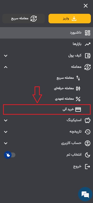 ۱) ابتدا وارد حساب کاربری خود شوید. در اپلیکیشن از منوی بالا سمت راست بر روی سه خط در قسمت معامله بر روی خرید آنی کلیک کنید