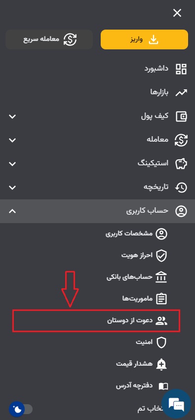 در اپلیکیشن از منوی بالا سمت راست بر روی سه خط و بعد حساب کاربری سپس روی دعوت از دوستان کلیک کنید.