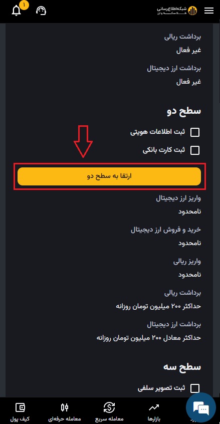 با تکمیل مرحله ۵ احراز هویت، شما به سطح ۲ ارتقا پیدا خواهد کرد و سقف های واریز/برداشت/معامله برای شما افزایش پیدا خواهد کرد.