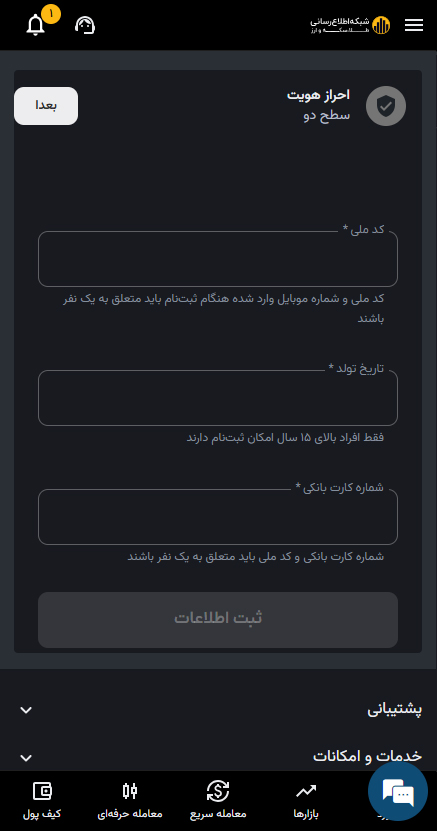 برای رسیدن به سطح دو لازم است کد ملی، تاریخ تولد و شماره کارت بانکی خود را ثبت کنید تا اطلاعات پایه تایید شود.