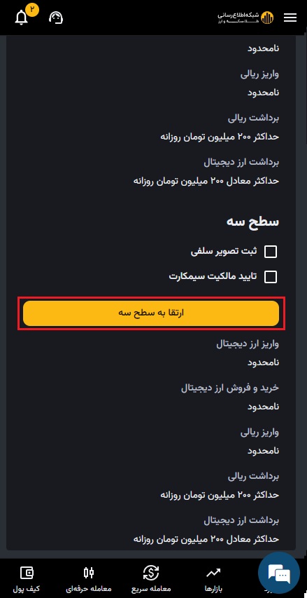 برای ارتقا به سطح سوم، ابتدا میبایست احراز هویت سطح دو را تکمیل کرده باشید. سپس برای ارتقا به سطح سوم طبق مراحل زیر می توانید احراز هویت را تکمیل کنید.