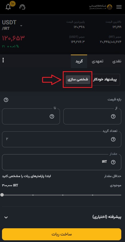 ۵) شما می توانید پارامترهای دلخواه خود را در قسمت سمت چپ صفحه وارد کنید. این پارامترها شامل تعیین قیمت کمینه، قیمت بیشینه و تعداد گرید است. در حالت پیشرفته نیز امکان مشخص کردن قیمت شروع، حد ضرر و حد سود وجود دارد.