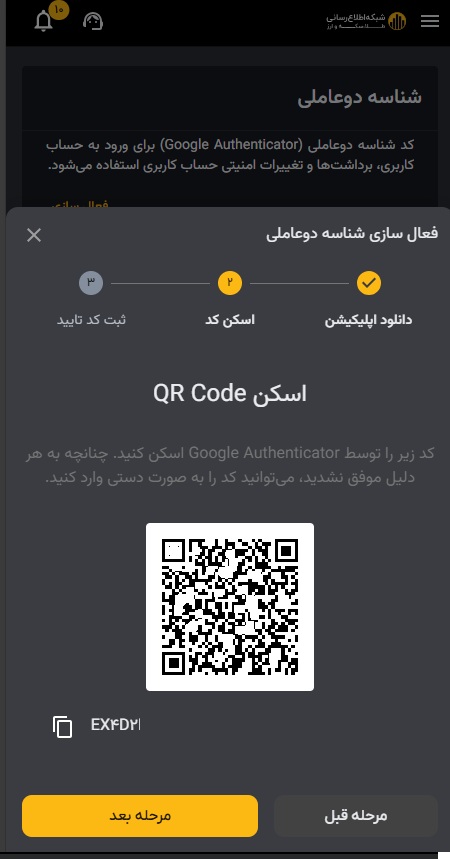 ۵) دوربین خود را در مقابل QR code ای که توسط راستین تولید شده است قرار دهید. پس از آن که کد توسط موبایل شما شناسایی شد، روی مرحله بعد کلیک نمایید.در صورت عدم شناسایی کد را به صورت دستی وارد کنید.