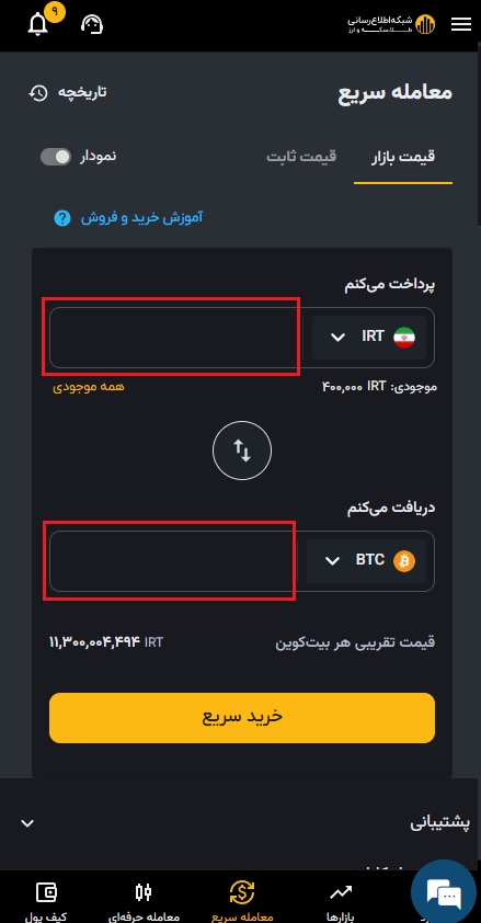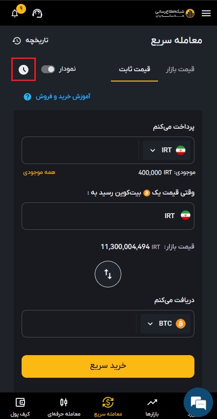 در معامله سریع، سیستم در کوتاه ترین زمان بهترین قیمت را برای شما پیدا می کند. این نوع معامله نیز تیکری بوده و کارمزد آن برابر با ۰.۲% است.