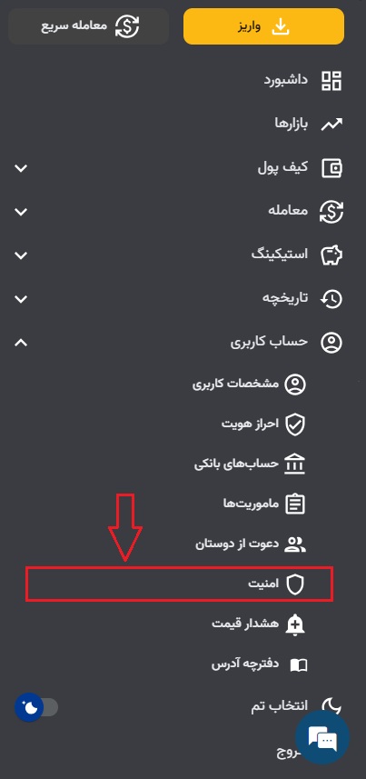 ۱) در اپلیکیشن از بالا سمت راست بر روی سه خط زده و سپس قسمت “حساب کاربری” را باز و بر روی “امنیت” را انتخاب کنید.