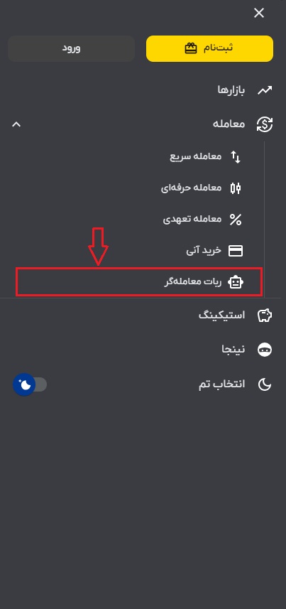 ۲) در اپلیکیشن از منوی بالا سمت راست بر روی سه خط در قسمت معامله گزینه “ربات معامله گر” را انتخاب کنید.